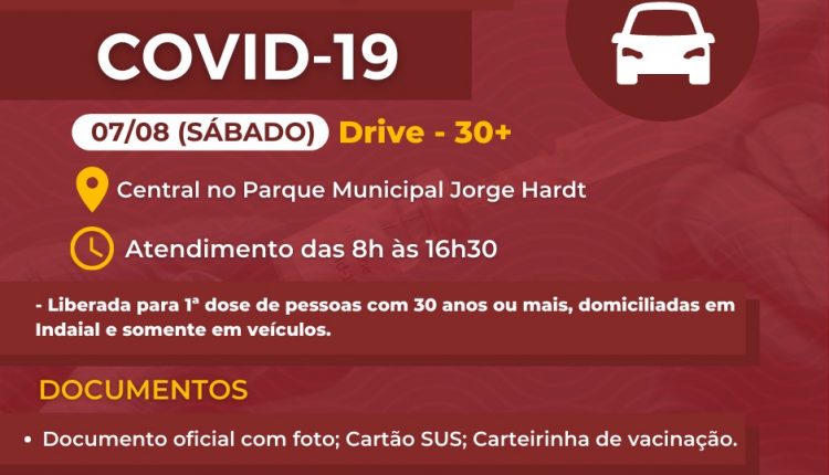 INDAIAL – Neste sábado, 7 de agosto, a Secretaria de Saúde promove mais uma edição especial do Drive-Thru para vacinação contra a Covid-19. A ação acontecerá no Parque Municipal Jorge Hardt, das 8h às 16h30. No dia, a imunização será liberada para aplicação da 1ª dose em pessoas com 30 anos ou mais, domiciliadas em Indaial e somente em veículos. É preciso apresentar carteirinha de vacinação, Cartão do SUS e documento oficial com foto.