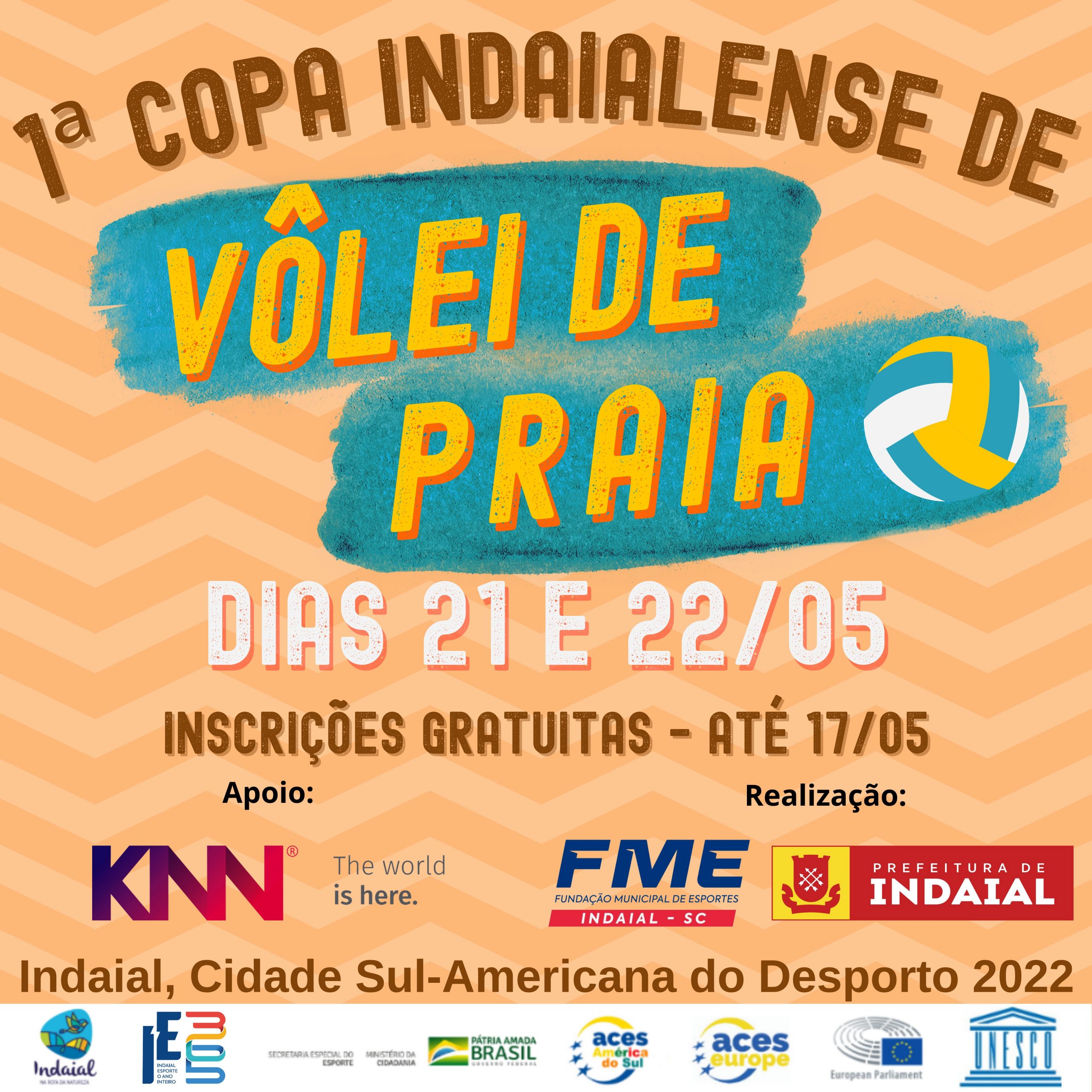 INDAIAL – A FME Indaial está com as inscrições abertas para a disputa da 1ª Copa Indaialense de Vôlei de Praia que será disputada nos dias 21 e 22 de maio no Centro Esportivo Bernardo Pisetta. As inscrições estão abertas para duplas nas categorias adulto masculino e feminino e também para as categorias sub 13 e sub15 masculino e feminino.