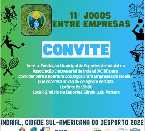 INDAIAL – A Fundação Municipal de Esportes e a Associação Empresarial de Indaial (Acidi) realizarão a abertura oficial dos Jogos Entre Empresas – Edição 2022 nesta quinta, 4, a partir das 19h, no Ginásio de Esportes Sérgio Luiz Petters, no Centro. Toda a comunidade está convidada a prestigiar o evento que contará com a presença de autoridades, atletas e dirigentes.