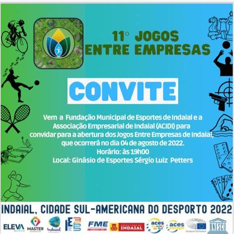INDAIAL – A Fundação Municipal de Esportes e a Associação Empresarial de Indaial (Acidi) realizarão a abertura oficial dos Jogos Entre Empresas – Edição 2022 nesta quinta, 4, a partir das 19h, no Ginásio de Esportes Sérgio Luiz Petters, no Centro. Toda a comunidade está convidada a prestigiar o evento que contará com a presença de autoridades, atletas e dirigentes.
