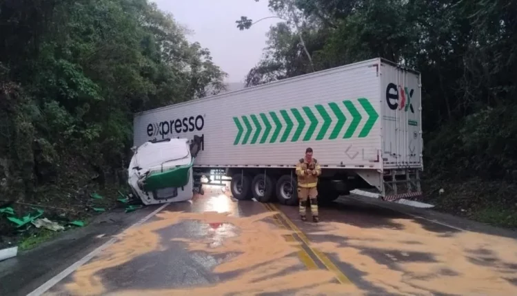 De acordo com a Polícia Rodoviária Federal (PRF), a pista está bloqueada nos dois sentidos para a retirada da carreta envolvida na ocorrência.