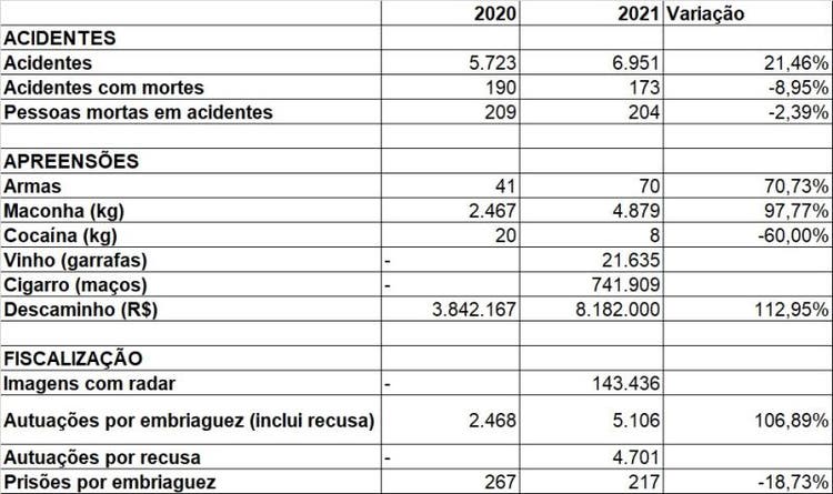 Ainda assim, um número do balanço das ocorrências de 2021 é visto pela PMRv como uma melhora em relação a 2020. É o número de acidentes com mortes, que caiu 9%, passando de 190 casos para 173. No número de pessoas mortas em acidentes, no entanto, a queda foi menor: apenas 2%, passando de 209 para 204.