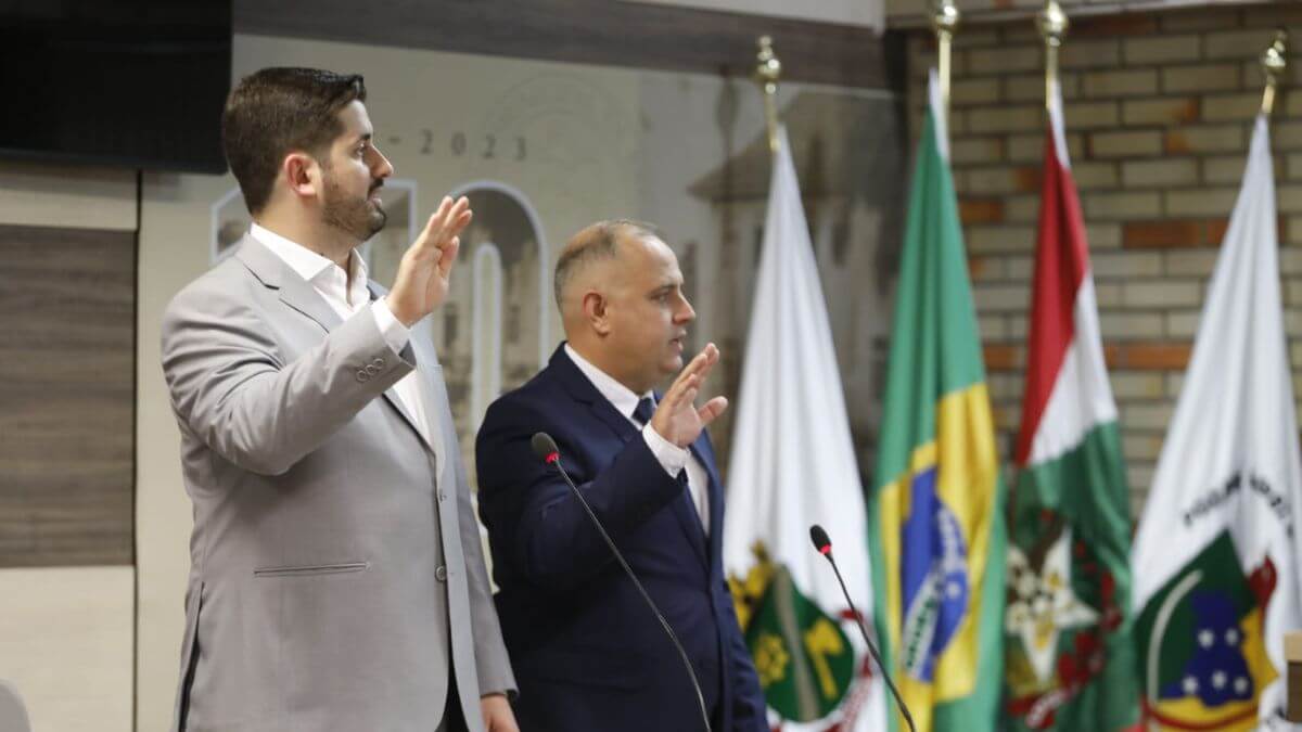 BRUSQUE – André Vechi (DC) e Deco Batisti (PL) foram empossados durante sessão na Câmara de Vereadores de Brusque no começo da noite desta segunda-feira (25). Esse é o último ato estabelecido pela Justiça Eleitoral para que a dupla assuma em definitivo o Executivo Municipal como prefeito e vice eleitos por voto popular. A diplomação de ambos já havia ocorrido na semana passada.