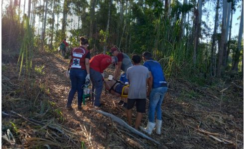Segundo as primeiras informações, um trabalhador, que realizava a derrubada de árvores, havia sido atingido na perna por um árvore na região das pernas. Uma viatura foi deslocada para o local em prioridade, em razão da distância e da situação. No local, foi constatado que um masculino de 26 anos, encontrava-se ainda na cena do ocorrido, apresentando suspeita de fratura em fêmur esquerdo.