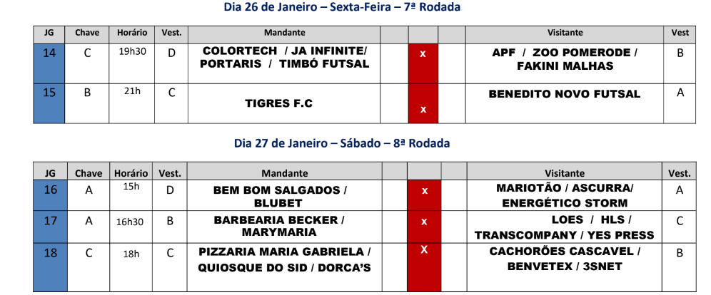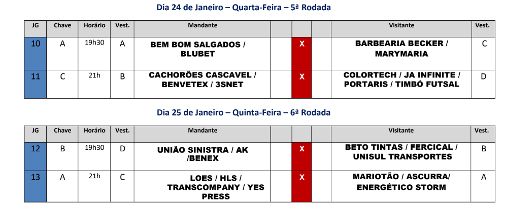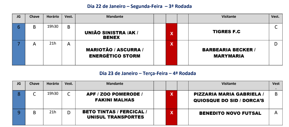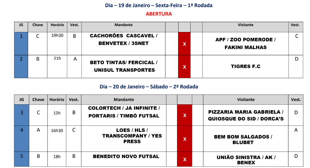 As duas equipes se enfrentam na abertura oficial do Torneio. Confronto este marcado para as 19h30 do dia 19 de Janeiro de 2024. Na sequência temos mais um grande jogo, Fercical/Unisul Transportes, que será representada pelo Joaçaba, contra o Tigres de Blumenau.