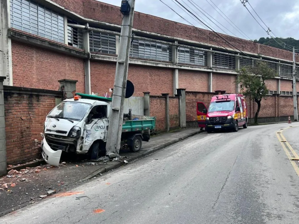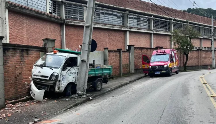 Um caminhão bateu contra um poste e um muro em frente à empresa Coteminas, em Blumenau, no bairro Progresso, no Distrito do Garcia. O acidente aconteceu neste sábado (11) e mobilizou o Corpo de Bombeiros Militar (CBMSC).