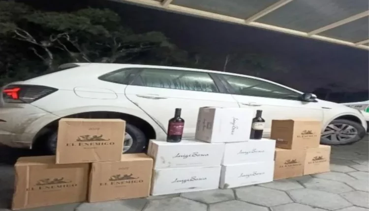 Segundo a PM, a ação começou após a denúncia de que um veículo trafegava em alta velocidade pela rodovia. O carro, um VW Polo, foi abordado com apoio de outras viaturas. Dentro dele, os policiais encontraram 30 garrafas da marca Luigi Bosca e 36 da marca El Enemigo, todas sem documentação legal.