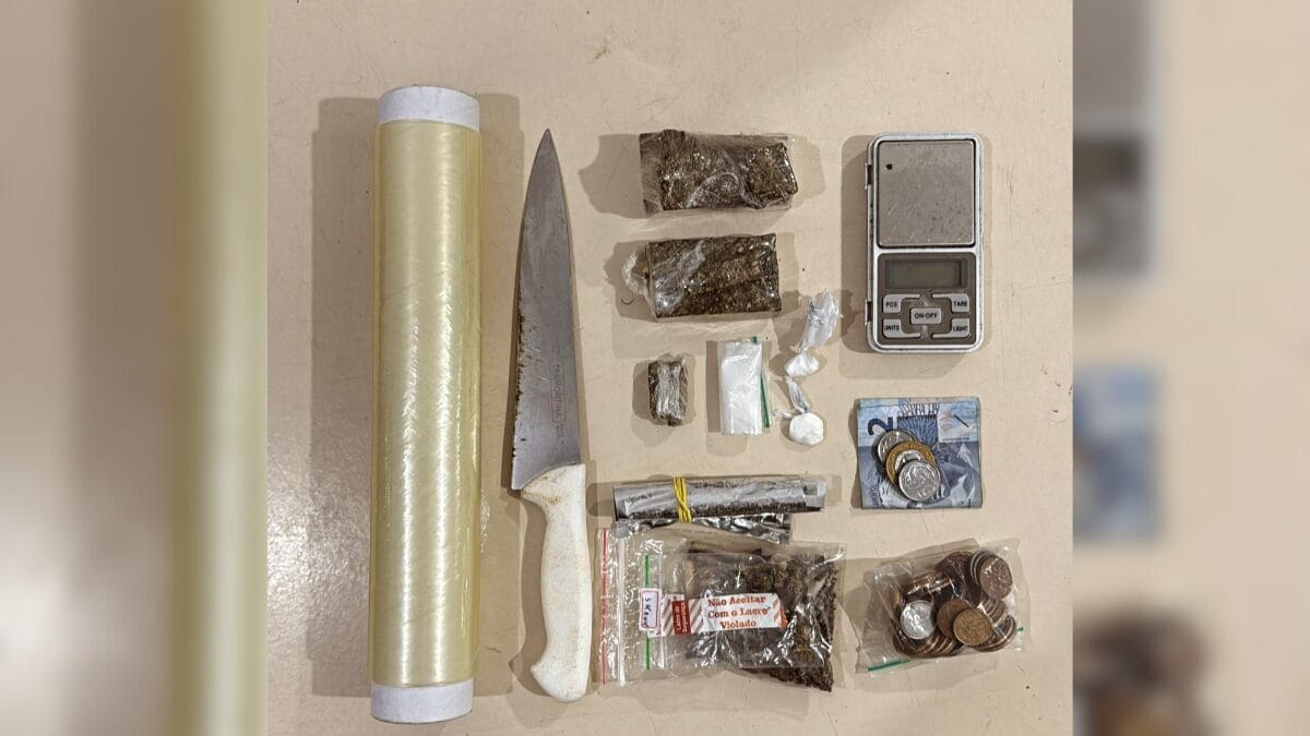 Dentro da casa do suspeito, a PM localizou diversas substâncias ilícitas e materiais utilizados na preparação e comercialização de drogas. Os policiais apreenderam aproximadamente 130 gramas de maconha, cinco gramas de cocaína, uma grama de skank, além de R$ 13,80 em espécie.
