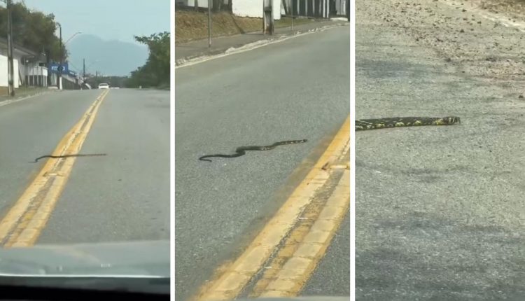 INDAIAL – Uma cobra parou o trânsito em Indaial nesta quarta-feira (11) e chamou a atenção pelo comprimento. A serpente foi flagrada atravessando a Rua Vereador Alvin Rauh Júnior, no bairro Nações. O motorista esperou o animal ir para o acostamento e só então arrancou com o veículo. Ele fez o registro no começo da tarde e o vídeo foi compartilhado pela página Indahell.