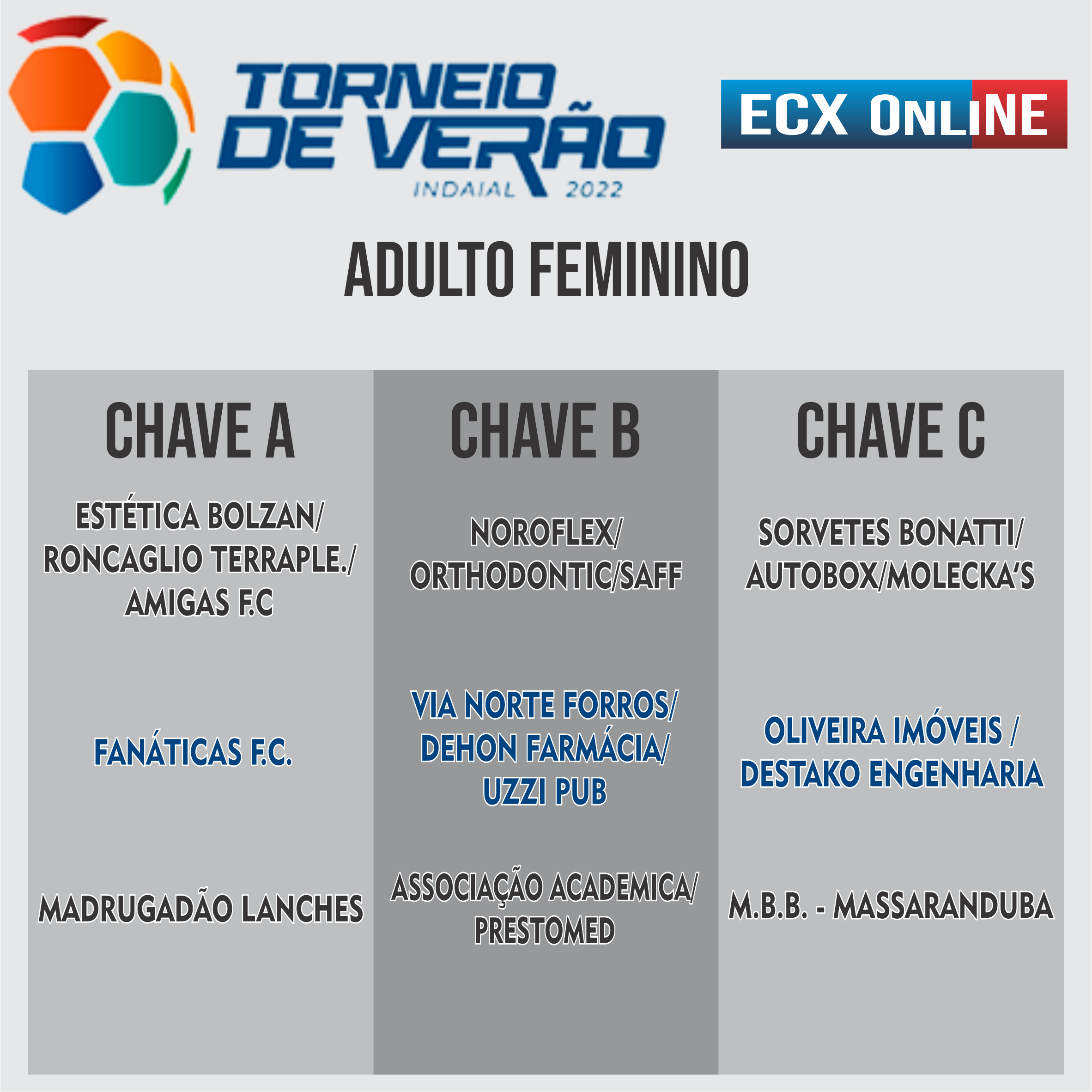 Categoria Adulto Feminino, divida em três chaves com três times cada.