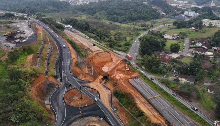 BR 470 – Fotos recentes da obra do novo viaduto da BR-470 no bairro Fortaleza, em Blumenau, revelam uma particularidade desse ponto da duplicação: diferente dos outros viadutos da região, que precisam da elevação da rodovia, neste caso o caminho é o contrário. Ou seja, é necessário escavar. É tanta terra que precisa ser removida que uma verdadeira cratera se formou na BR.