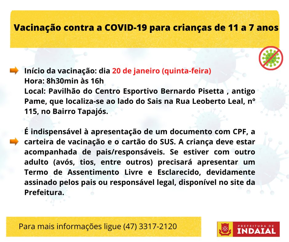 contra a COVID-19 para crianças de 11 a 7 anos a partir desta quinta-feira, dia 20 de janeiro, além da vacinação para os grupos prioritários. A vacinação exclusiva para as crianças está ocorrendo no Pavilhão do Centro Esportivo Bernardo Pisetta, antigo Pame, que localiza-se ao lado do Sais, na Rua Leoberto Leal, nº 115, no bairro Tapajós, das 8h30min às 16h, de segunda a sexta-feira.