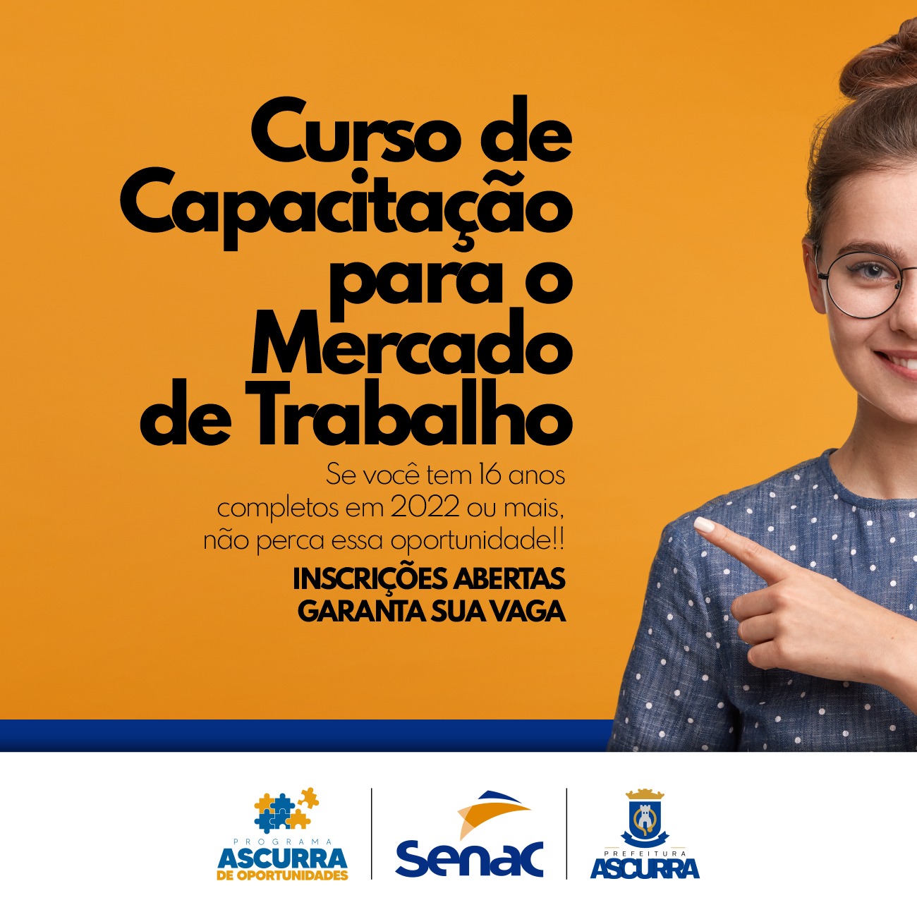 ASCURRA – A Prefeitura de ASCURRA, por meio do Programa Ascurra de Oportunidades, em parceria com o SENAC, está abrindo as inscrições para o Curso de Capacitação para o Mercado de Trabalho, programa gratuito de capacitação profissional para os jovens que buscam o primeiro emprego, ou que já estão no mercado de trabalho e querem se aperfeiçoar.