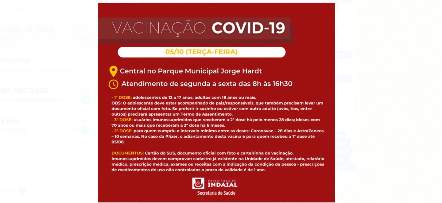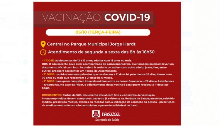 INDAIAL – Nesta terça, 5 de outubro, a Secretaria de Saúde de Indaial dá continuidade à vacinação contra a Covid-19 para os seguintes grupos: 1ª dose a pessoas com 12 anos ou mais; 3ª dose para idosos com 70 anos ou mais que receberam a 2ª dose há 6 meses e para usuários imunossuprimidos que foram imunizados com a 2ª dose há pelo menos 28 dias, além da 2ª dose para quem cumpriu o intervalo mínimo de 28 dias (Coronavac) e 10 semanas (AstraZeneca) – no caso da Pfizer usuários que receberam a 1ª dose até 5 de agosto já podem ser imunizados com a 2ª dose.