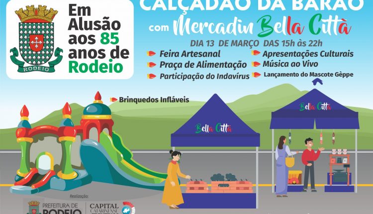 RODEIO – Para comemorar os 85 anos de emancipação político administrativa de Rodeio, a Prefeitura juntamente com a Diretoria de Cultura e Turismo fará uma programação diversificada, e no dia 13 de março será realizado o CALÇADÃO DA BARÃO com o MERCADIN BELLA CITTÀ na Rua Barão do Rio Branco (em frente à sede da Prefeitura) das 15h ás 22h. Lembrando que segunda, 14/03, é decretado feriado municipal!