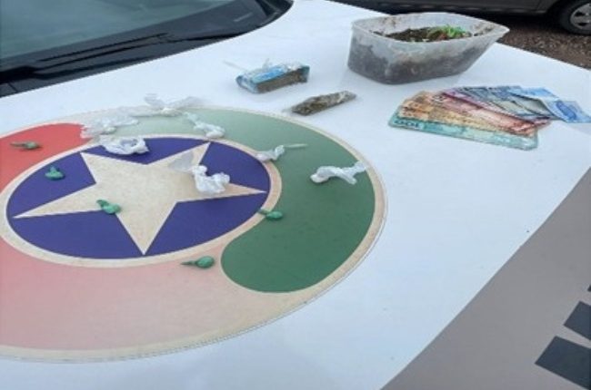 O abordado relatou que cultivava um pé de maconha em sua residência. No endereço indicado, os policiais encontraram outro homem, de 26 anos, que arremessou um pote branco em direção a uma área de mata ao notar a aproximação da viatura. O recipiente foi localizado e continha um torrão de maconha de 76,5 gramas e mais sete buchas de cocaína também preparadas para o comércio.
