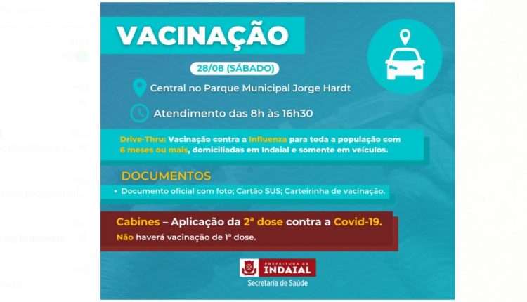 INDAIAL – Neste sábado, 28 de agosto, a Secretaria de Saúde irá promover uma edição especial do Drive-Thru para vacinação contra a Influenza (Gripe).