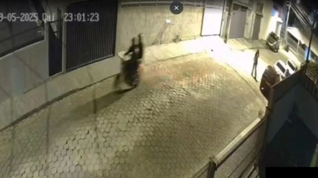 Imagens de uma câmera de segurança mostram o momento em que a motocicleta para diante da casa da cantora. Em seguida, Débora aparece abrindo a porta do carro, estacionado na rua, e é surpreendida pela dupla.