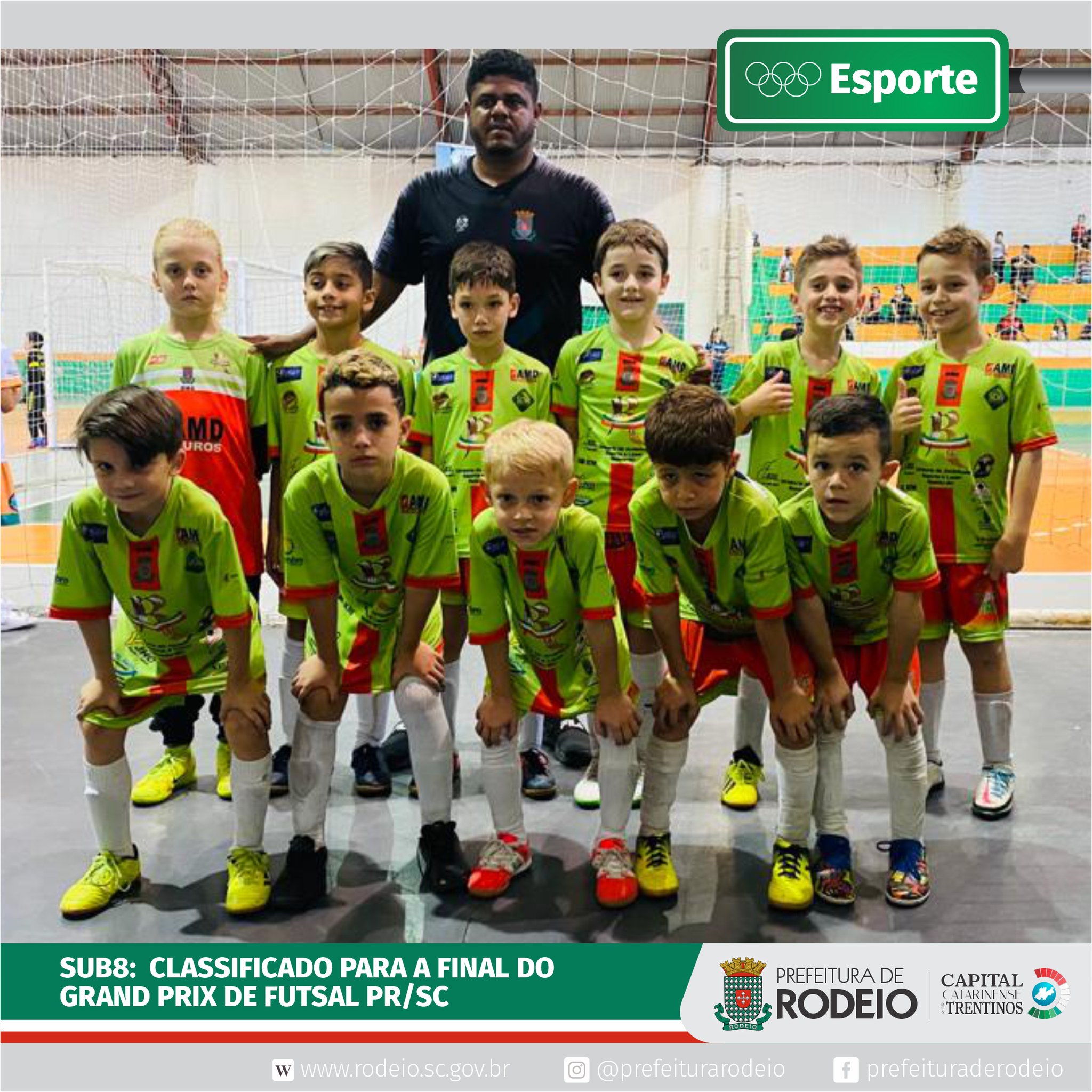 RODEIO – As esquipes da Diretoria de Esportes das categorias Sub 8 anos e Sub 9 anos estão classificadas para as finais do Grand Prix de Futsal que conta com a participação de times do Estado do Paraná e Santa Catarina.