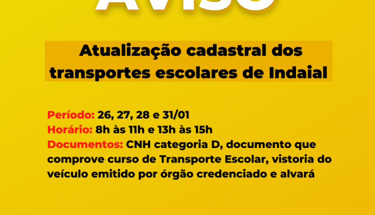 INDAIAL – O Departamento Municipal de Trânsito (Demuttin) informa que, entre os dias 26, 27, 28 e 31 de janeiro, motoristas devem realizar a atualização cadastral dos transportes escolares de Indaial. Para isso, a orientação é comparecer às dependências do Demuttin, localizado na Rua Marechal Floriano Peixoto, 49, Centro, das 8h às 11h e das 13h às 15h.