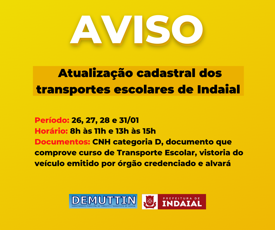INDAIAL – O Departamento Municipal de Trânsito (Demuttin) informa que, entre os dias 26, 27, 28 e 31 de janeiro, motoristas devem realizar a atualização cadastral dos transportes escolares de Indaial. Para isso, a orientação é comparecer às dependências do Demuttin, localizado na Rua Marechal Floriano Peixoto, 49, Centro, das 8h às 11h e das 13h às 15h.