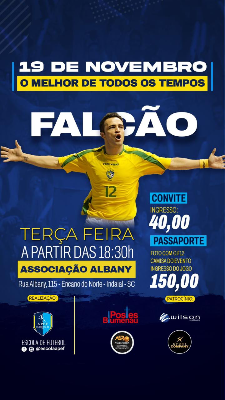 INDAIAL – Um dos maiores jogadores do futsal mundial, Alessandro Rosa Vieira, ou simplesmente Falcão, estará na cidade de Indaial-SC na próxima terça-feira (19) para um jogo festivo.