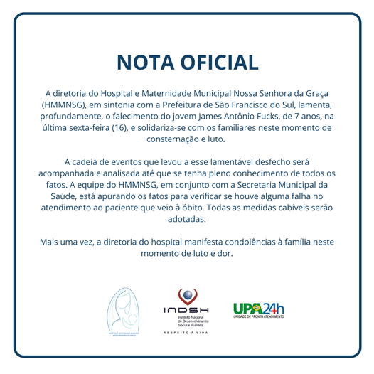 O Hospital e Maternidade Municipal Nossa Senhora da Graça se manifestou sobre a morte de James em nota publicada nas redes sociais. A instituição diz que lamenta profundamente o falecimento e se solidariza com os familiares.
