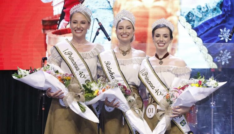 BLUMENAU – Gabrielle Cristine Kratz é a nova rainha da Oktoberfest Blumenau para 2025. Completam o trio que representará a 40ª edição Giane Prochnow e Gabriela Schoeler, primeira e segunda princesa, respectivamente. As três e as demais finalistas tiveram de discursar na noite deste domingo (27) diante do público e dos jurados no Spaten Platz, um dos setores do Parque Vila Germânica que ficou tomado pelos amigos e familiares das candidatas.