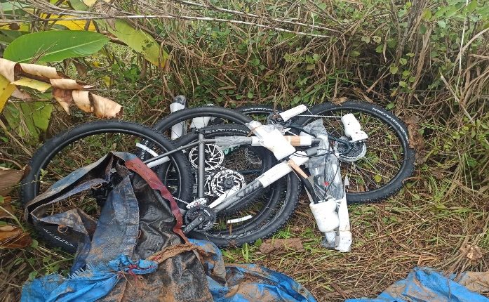 INDAIAL – A guarnição da Polícia Militar, foi acionada pela Central Regional de Emergência para verificar um masculino que estaria em atitude suspeita, vendendo equipamentos e roupas de atividade de ciclismo. Este masculino estaria caminhando a pé em direção ao bairro carijós. Após verificação, foi abordado um homem na Rua 7 de Setembro, que em revista pessoal não foi encontrado os tais equipamentos mencionados na denúncia, mas devido ele estar usando roupas e calçados novos, de uma pessoa que pratica ciclismo, foi indagado o mesmo sobre suas vestes e sobre o furto ocorrido na cidade de Timbó na mesma madrugada. Foi então que o mesmo informou, que algumas bicicletas estavam no mato em frente ao Supermercado Unibox, na BR 470, e alguns equipamentos, roupas e acessórios estavam em sua residência.