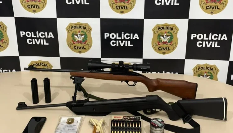Durante as buscas realizadas nesta quarta-feira, os policiais apreenderam duas espingardas, uma calibre .22 e outra de pressão, projéteis de chumbinho, dois silenciadores de uso restrito, 20 munições calibre .308 WIN e 98 esferas metálicas.
