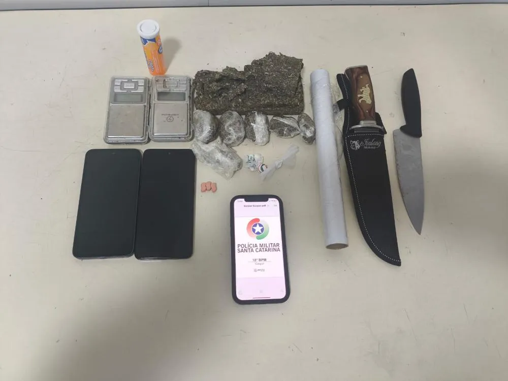 Na busca domiciliar, os policiais encontraram 384 gramas de maconha, 5 buchas de cocaína, 3 comprimidos de ecstasy, além de duas balanças de precisão, dois celulares, duas facas, um rolo de plástico filme e R$ 24 em dinheiro.