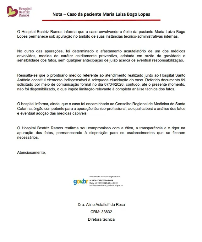 INDAIAL – No início da manhã desta quinta-feira (16), o Hospital Beatriz Ramos, de Indaial, comunicou o afastamento cautelar de um dos médicos que atendeu a jovem Maria Luiza, grávida aos 18 anos, que faleceu no início de abril de 2026, após suspeitas de negligência médica.