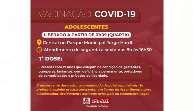 INDAIAL – A partir desta quarta, 1º de setembro, a Secretaria de Saúde de Indaial inicia a vacinação contra a Covid-19 em adolescentes. A imunização para esse público será escalonada, conforme orientações do Estado. Nessa quarta já podem ser vacinadas pessoas com 17 anos que estejam na condição de gestantes, puérperas, lactantes, com deficiência permanente, portadores de comorbidades e privados de liberdade.