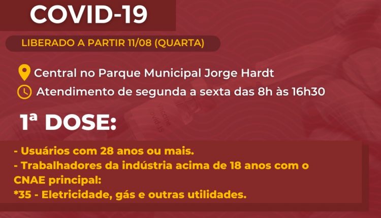 INDAIAL – A partir desta quarta, 11 de agosto, a Secretaria de Saúde de Indaial libera a vacinação contra a Covid-19 para pessoas com 28 anos ou mais e trabalhadores da Indústria acima de 18 anos com o CNAE principal: 35 – Eletricidade, gás e outras utilidades.