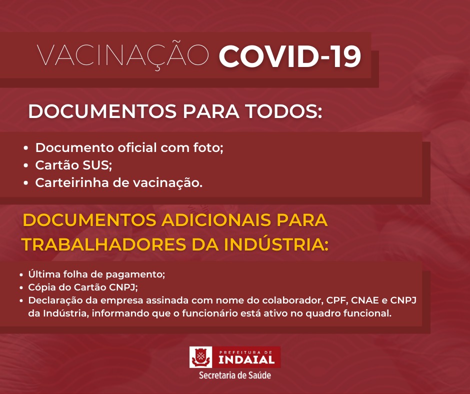 É preciso apresentar carteirinha de vacinação, Cartão do SUS e documento oficial com foto. Trabalhadores da indústria ainda devem levar a cópia da última folha de pagamento; cópia do Cartão CNPJ e declaração da empresa assinada com nome do colaborador, CPF, CNAE e CNPJ da Indústria, informando que o funcionário está ativo no quadro funcional.