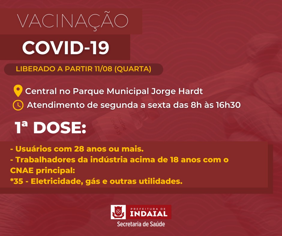 INDAIAL – A partir desta quarta, 11 de agosto, a Secretaria de Saúde de Indaial libera a vacinação contra a Covid-19 para pessoas com 28 anos ou mais e trabalhadores da Indústria acima de 18 anos com o CNAE principal: 35 – Eletricidade, gás e outras utilidades.