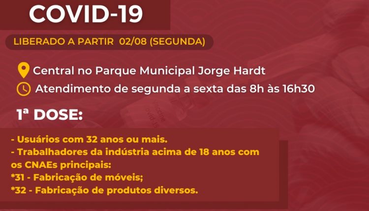 INDAIAL – A partir desta segunda, 2 de agosto, a Secretaria de Saúde de Indaial libera a vacinação contra a Covid-19 para pessoas com 32 anos ou mais e trabalhadores da Indústria acima de 18 anos com os CNAEs principais: 31 – Fabricação de móveis e 32 – Fabricação de produtos diversos.