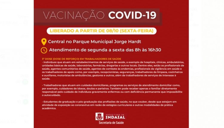 INDAIAL – Nesta sexta, 8 de outubro, Indaial começa a aplicar a dose de reforço (3ª dose) contra a Covid-19 em trabalhadores de saúde que receberam a 2ª dose há 6 meses. O atendimento é realizado na Central instalada no Parque Municipal Jorge Hardt, por ordem de chegada, através de senhas, de segunda a sexta, das 8h às 16h30.