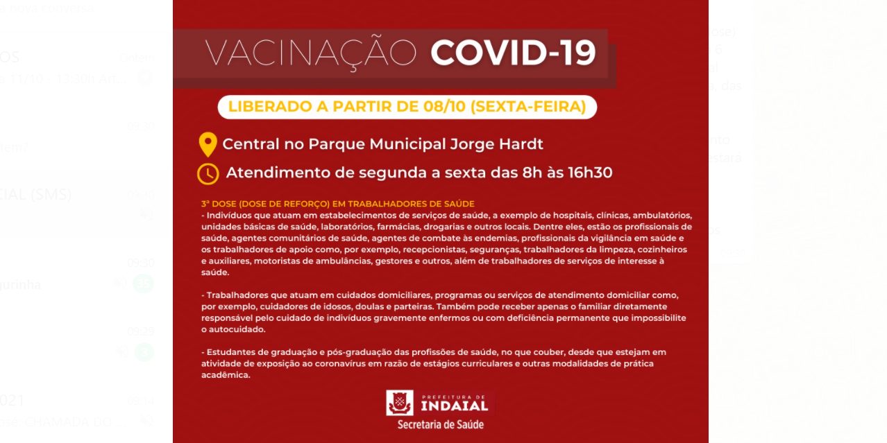 INDAIAL – Nesta sexta, 8 de outubro, Indaial começa a aplicar a dose de reforço (3ª dose) contra a Covid-19 em trabalhadores de saúde que receberam a 2ª dose há 6 meses. O atendimento é realizado na Central instalada no Parque Municipal Jorge Hardt, por ordem de chegada, através de senhas, de segunda a sexta, das 8h às 16h30.
