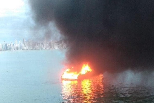 Lancha fica destruída após pegar fogo em praia de Balneário Camboriú