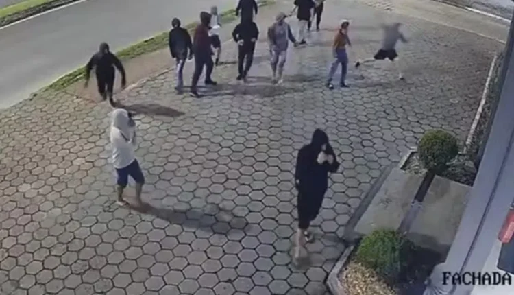 As imagens mostram o grupo quebrando o vidro da fachada, entrando no estabelecimento e fugindo pilotando 12 motocicletas.