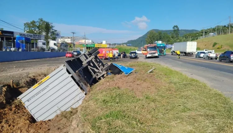 Manhã de quinta-feira começa com acidente e tombamento de carreta no bairro Rainha, em Rio do Sul