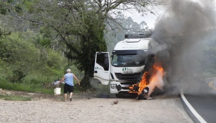 Moto bate em caminhão, pega fogo e acidente mata homem na BR-470, em Apiúna