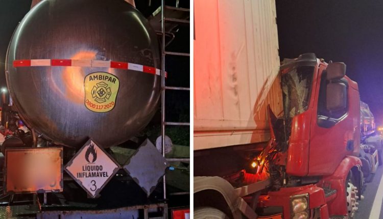 Um caminhão-tanque carregado com querosene e álcool colidiu na traseira de outro veículo de carga na BR-101, em Balneário Piçarras, na noite desta terça-feira (12), deixando o motorista, de 55 anos, preso às ferragens.