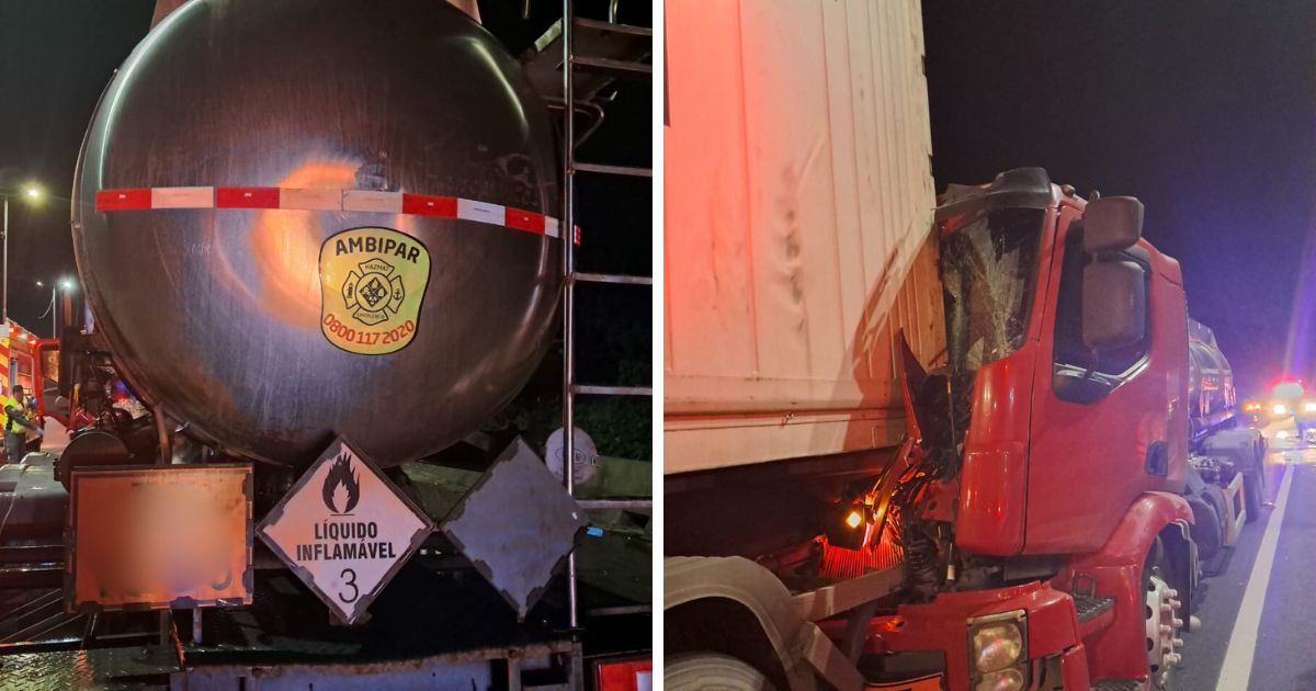 Um caminhão-tanque carregado com querosene e álcool colidiu na traseira de outro veículo de carga na BR-101, em Balneário Piçarras, na noite desta terça-feira (12), deixando o motorista, de 55 anos, preso às ferragens.