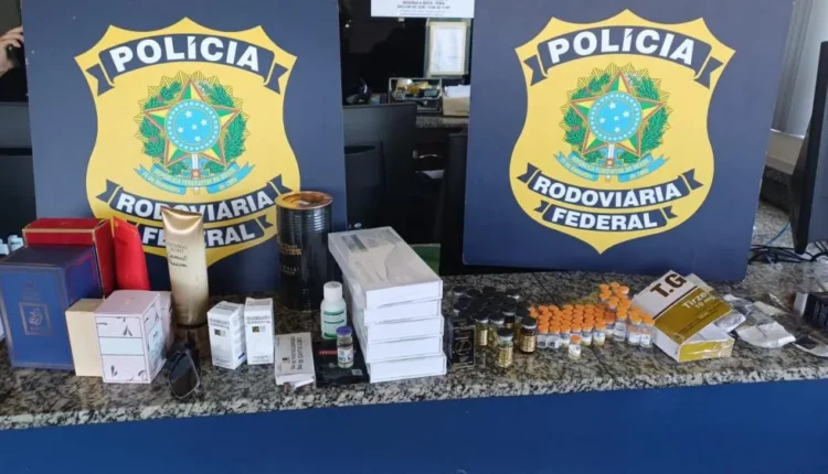 No interior do automóvel, os agentes localizaram inicialmente uma sacola térmica com medicamentos para emagrecer. Na continuidade da fiscalização, encontraram compartimentos ocultos no câmbio, painel, console central e assoalho do passageiro, onde estavam armazenadas dezenas de ampolas de anabolizantes, pílulas abortivas, outros remédios irregulares, além de cadernos com anotações referentes a vendas.