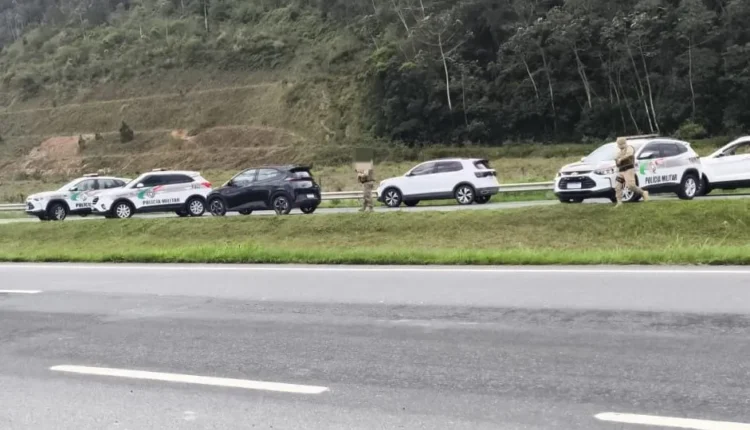 O veículo, um BYD com placa adulterada, havia sido roubado em Navegantes, no Litoral Norte, e foi interceptado na altura do km 32 da rodovia. Durante a abordagem, o motorista teria saído do carro armado e apontado contra os policiais. Os PMs reagiram e atingiram o suspeito, que fugiu para uma área de mata.