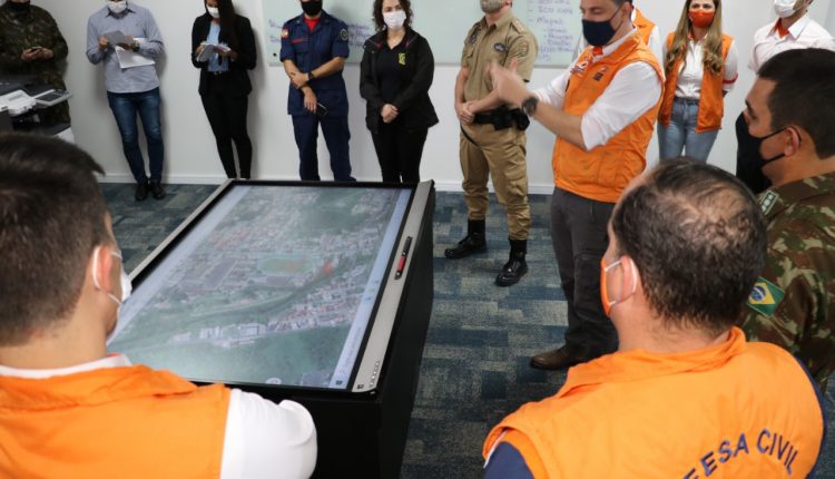 Nesta tarde, todas as instituições envolvidas se reuniram no Centro Integrado de Gerenciamento de Riscos e Desastres (CIGERD) para um “simulado de mesa”, ou seja, os órgãos envolvidos atuam como em uma operação real, apresentando as situações do evento climático extremo – com fotos e detalhes, além das estruturas disponíveis. Após as explanações que ocorreram parte presencial e parte por chamada de vídeo, houve a definição das estratégias na mesa tática, com suporte de um mapa digital.