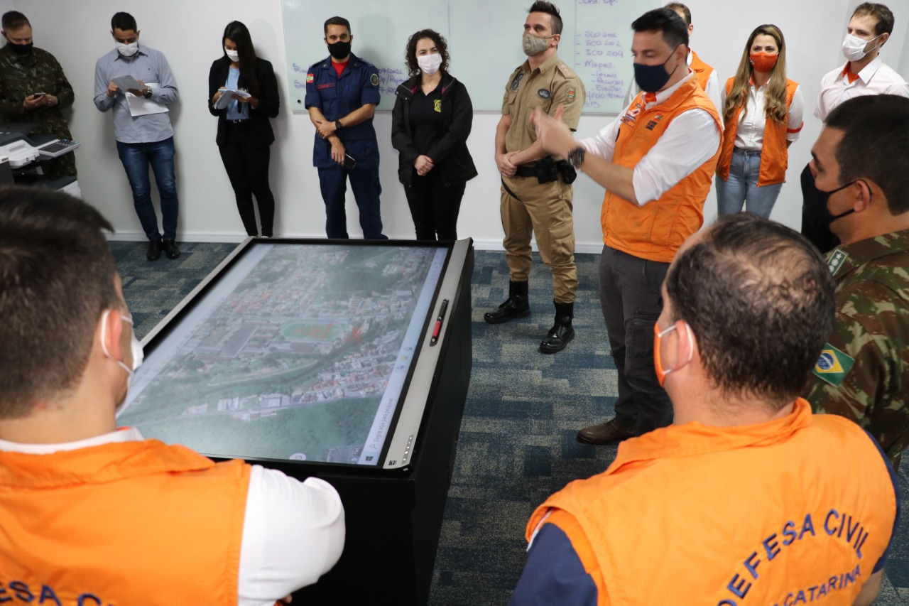 Nesta tarde, todas as instituições envolvidas se reuniram no Centro Integrado de Gerenciamento de Riscos e Desastres (CIGERD) para um “simulado de mesa”, ou seja, os órgãos envolvidos atuam como em uma operação real, apresentando as situações do evento climático extremo – com fotos e detalhes, além das estruturas disponíveis. Após as explanações que ocorreram parte presencial e parte por chamada de vídeo, houve a definição das estratégias na mesa tática, com suporte de um mapa digital.