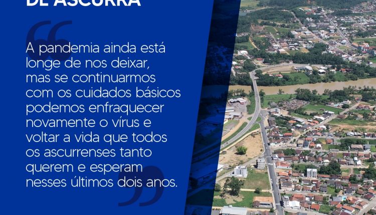 A Prefeitura de Ascurra, por meio de todas as suas secretarias, irá retornar com a campanha de conscientização para que todos reforcem-se nos cuidados básicos mas, é somente com a ajuda de vocês, empresários do município e consequentemente da população, que poderemos diminuir os casos positivos, reestabelecendo assim nossa vida normal.